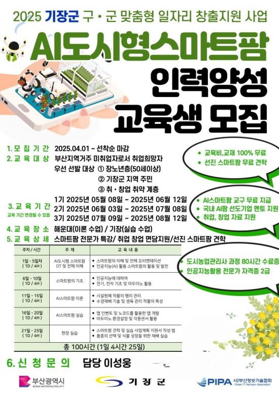 기장군(군수 정종복)은 부산시 주관 '2025년 구·군 맞춤형 일자리 창출 지원사업' 공모에 선정돼, 오는 5월 8일부터 'AI 도시형 스마트팜 인력 양성과정'을 운영한다.