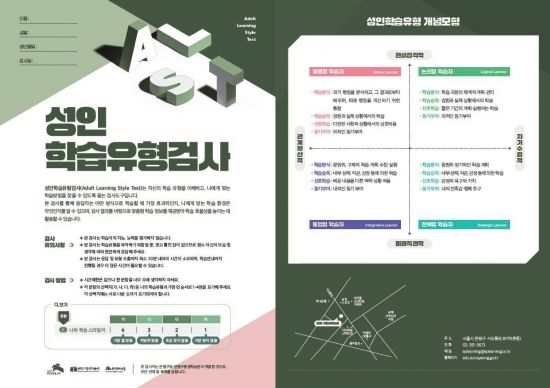 성인학습유형검사는 성인 학습자가 자신의 학습 유형을 이해하고 자신에게 맞는 학습 방법을 찾을 수 있게 돕는 검사 도구다. 은평구와 평생학습관이 2022년부터 3년에 걸쳐 공동 개발한 결과물이다.