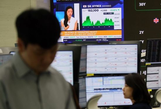 SK하이닉스 실적이 1분기로는 사상 최고치인 매출액 17조6391억원, 영업이익 7조4405억원, 순이익 8조1082억원의 실적을 기록한 24일 서울 중구 하나은행 딜링룸에서 외신뉴스가 하이닉스 주가를 보도하고 있다. SK하이닉스의 이번 실적은 지난해 4분기 실적에 이은 역대 두 번째로 높은 성과이고, 삼성전자 전사 영업이익률을 웃도는 규모이다.