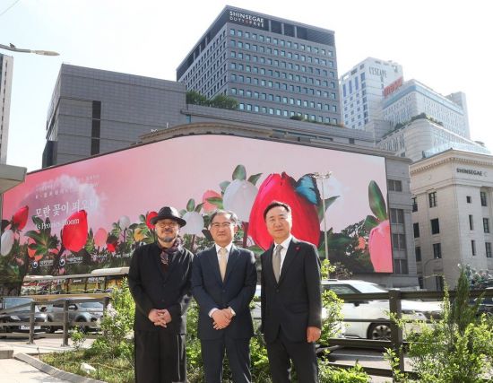 (왼쪽부터) 이병우 음악감독, 김재홍 국립중앙박물관장, 유신열 신세계디에프 대표가 서울 명동 신세계스퀘어에서 진행된 ‘모란 꽃이 피오니’ 상영회 후 기념 촬영하는 모습. (사진제공=신세계면세점)
