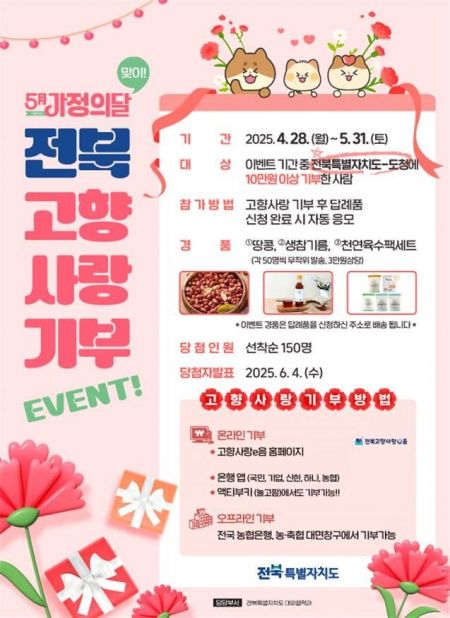 전북특별자치도가 5월 가정의 달을 맞아 오는 28일부터 내달 31일까지 '전북 고향사랑 기부 이벤트'를 진행한다.