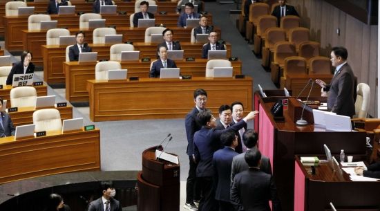 권성동 국민의힘 원내대표가 24일 국회 본회의장에서 열린 한덕수 대통령 권한대행 국무총리 시정연설 후 우원식 국회의장의 발언 도중 항의하고 있다.
