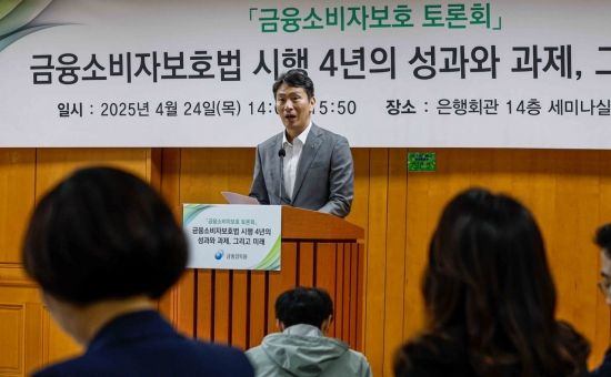 이복현 금융감독원장이 24일 서울 중구 은행회관에서 열린 '금융소비자보호 토론회'에 참석해 인사말 하고 있다.