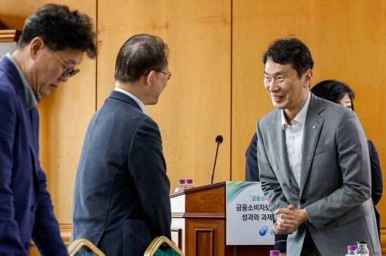 이복현 금융감독원장이 24일 서울 중구 은행회관에서 열린 '금융소비자보호 토론회'에서 참석자들과 대화를 나누고 있다.