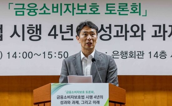 이복현 금융감독원장이 24일 서울 중구 은행회관에서 열린 '금융소비자보호 토론회'에 참석해 인사말 하고 있다.