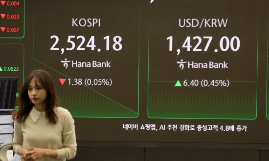 24일 한국경제가 3분기만에 마이너스 성장을 기록한 보도가 나오자 코스피 지수가 마이너스로 전환되고 있다. 서울 중구 하나은행 딜링룸 지수 현황판에 코스피 지수가 표시되고 있다. 2025.04.24 윤동주 기자