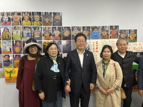 이재명 더불어민주당 대선 경선 후보가 24일 광주 동구 전일빌딩245 1층 '나에게 민주주의는 000이다' 전시 코너에서 지지자들과 기념 촬영을 하고 있다. 이 대표는 이날부터 1박 2일 일정으로 민주당 세 번째 권역별 순회 경선지인 호남을 방문 중이며, 오후에는 5·18민주화운동의 상징인 전일빌딩에서 '대한민국 민주화를 이끈 시민들'을 주제로 간담회를 진행하고 있다. 송보현 기자