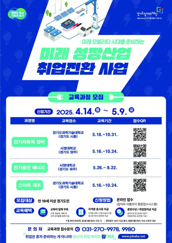 이진희 도 일자리재단 융합인재본부장은 "도내 우수한 첨단 인프라를 갖춘 대학과 함께 전기차, 전기에너지, 스마트제조 등 미래 산업에서 요구하는 기술을 익히고, 취업까지 연계될 수 있도록 적극 지원할 계획"이라며 "많은 청년과 구직자들이 이번 교육을 통해 미래 산업을 이끌 인재로 성장하길 바라며, 경기도일자리재단도 이러한 교육프로그램을 확대해 나갈 수 있도록 노력하겠다"고 말했다.