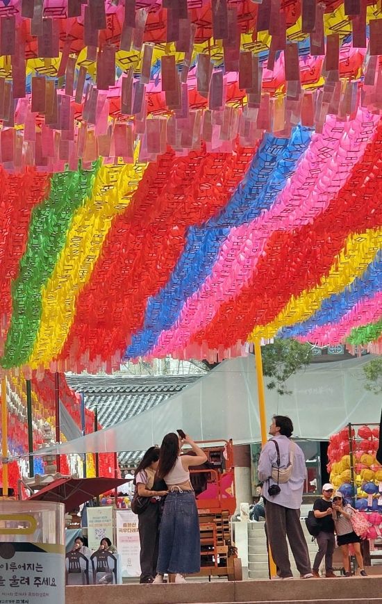 부처님오신날을 10일 앞둔 25일 서울 종로구 조계사를 찾은 외국인 관광객들이 소원성취 연등 아래에서 사진을 찍고 있다.