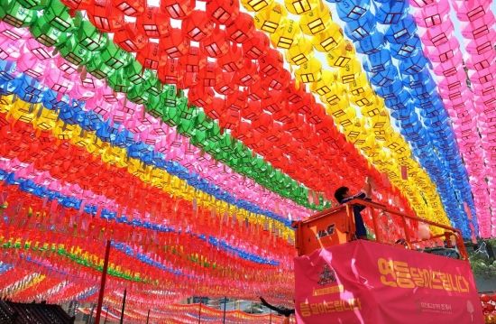 부처님오신날을 10일 앞둔 25일 서울 종로구 조계사 관계자가 시민들이 접수한 소원성취 연등을 매달고 있다. 2025.4.25 조용준 기자