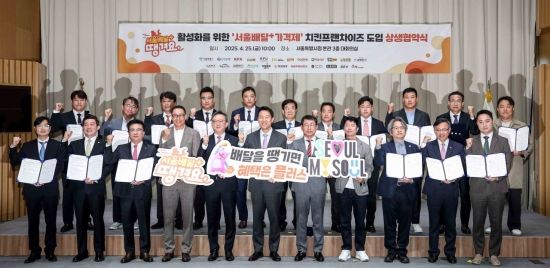 오세훈 서울시장이 25일 서울 중구 서울시청에서 열린 '공공배달 서비스 활성화 위한 치킨 프랜차이즈 브랜드 업무협약식'에 참석해 치킨 프랜차이즈 대표 및 업무협력 단체 대표자들과 기념촬영을 하고 있다.