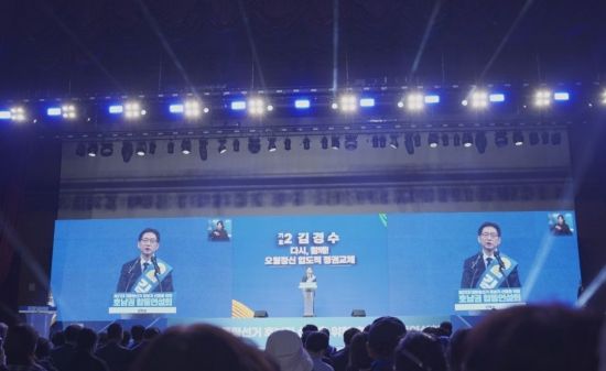 26일 오후 김경수 대선 경선 후보는 광주 김대중컨벤션센터에서 열린 호남권 합동연설회에서 정견 발표를 통해 "5대 권역별 메가시티 자치정부로 지역을 골고루 발전시키겠다"고 밝혔다.
