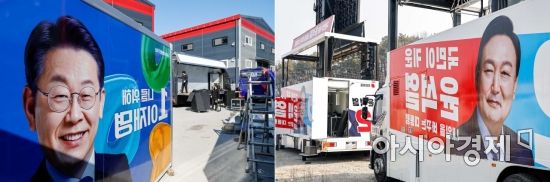 제20대 대통령선거를 한달가량 앞둔 2022년 2월 경기도 김포 차량광고업체 에바다에서 직원들이 이재명 더불어민주당 대선후보 선거유세에 사용될 연단을 제작하고 있다./김포=강진형 기자aymsdream@