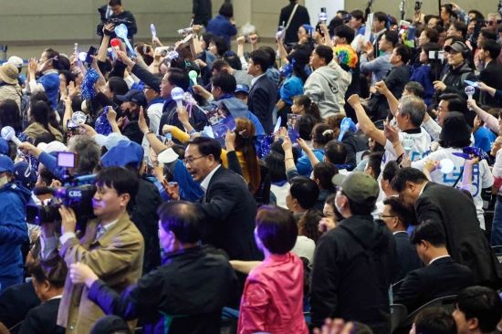 27일 경기 고양시 킨텍스에서 열린 '더불어민주당 제21대 대통령선거 후보자 선출 위한 수도권, 강원, 제주 합동연설회'에서 당원들이 환호하고 있다.