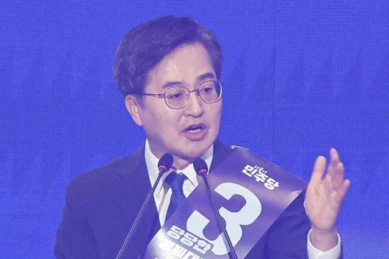 김동연 더불어민주당 대통령경선 후보가 27일 경기 고양시 킨텍스에서 열린 '더불어민주당 제21대 대통령선거 후보자 선출 위한 수도권, 강원, 제주 합동연설회'에 참석해 정견발표 하고 있다.