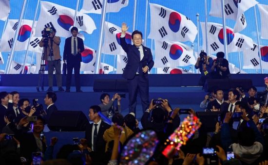 더불어민주당 대통령선거 후보로 선출된 이재명 후보가 27일 경기 고양시 킨텍스에서 열린 '더불어민주당 제21대 대통령선거 후보자 선출 위한 수도권, 강원, 제주 합동연설회'에서 당원들에게 인사하고 있다.