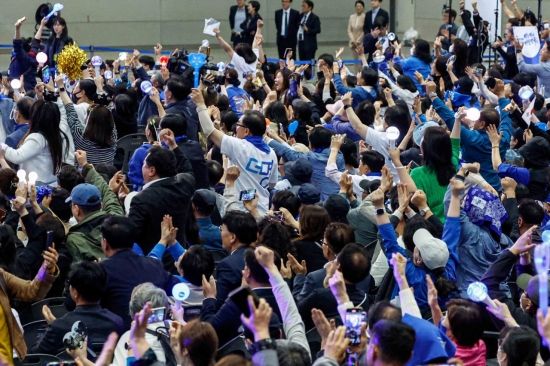 27일 경기 고양시 킨텍스에서 열린 '더불어민주당 제21대 대통령선거 후보자 선출 위한 수도권, 강원, 제주 합동연설회'에서 당원들이 환호하고 있다.