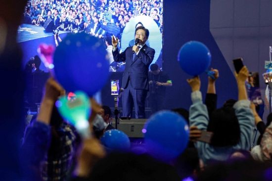 더불어민주당 대통령선거 후보로 선출된 이재명 후보가 27일 경기 고양시 킨텍스에서 열린 '더불어민주당 제21대 대통령선거 후보자 선출 위한 수도권, 강원, 제주 합동연설회'에서 수락연설을 하고 있다. 2025.4.27. 강진형 기자