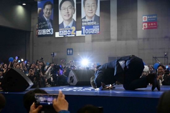 이재명 더불어민주당 대선 후보가 27일 경기 고양시 킨텍스에서 열린 수도권·강원·제주 합동연설회에서 수락 연설을 마친 뒤 지지자 들을 향해 큰 절을 하고 있다. 국회사진기자단