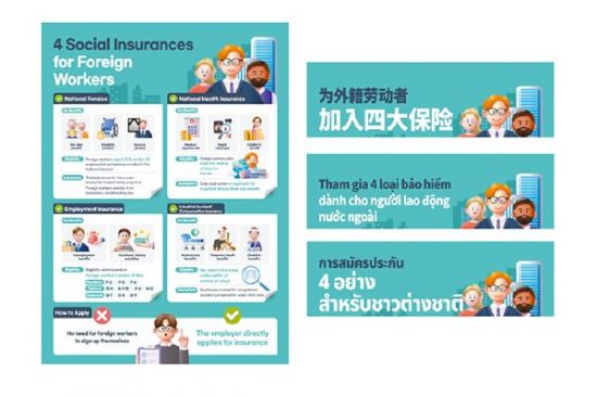 외국인들의 관심이 높은 '4대 보험' 등 근로 관련 인포그래픽이 가장 먼저 제작됐다. 국민연금, 국민건강보험, 고용보험, 산업재해보상보험의 주요 혜택과 가입 대상, 가입 제외 대상을 정리해 4대 보험의 핵심 내용을 한눈에 파악할 수 있도록 했다. 이를 통해 외국인들은 복잡한 법령을 일일이 확인하지 않아도 본인이 보험 가입 대상인지 쉽게 알 수 있다. 인포그래픽 하단에는 '외국인 근로자가 직접 등록할 필요는 없습니다(No need for foreign workers to sign up themselves)', '고용주가 직접 보험을 신청해야 합니다(The employer directly applies for insurance)' 등의 안내 문구를 넣어 실생활에 바로 적용할 수 있도록 했다.