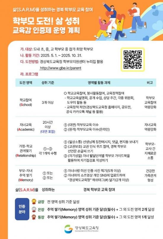 경북교육청(교육감 임종식)은 가정과 학교 간의 소통과 신뢰를 강화하고, 학부모의 자율적 교육 참여 문화를 조성하기 위해 '2025 학부모 도전! 삶 성취 교육감 인증제'를 오는 5월부터 본격 시행한다고 29일 밝혔다.