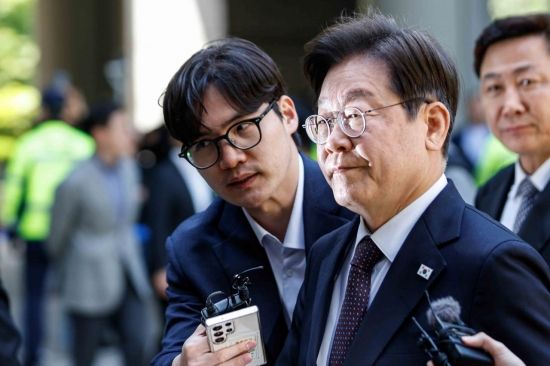 대장동 배임 및 성남FC 뇌물 혐의를 받고 있는 이재명 더불어민주당 대선 후보가 29일 서울 서초구 서울중앙지방법원에서 열린 공판에 출석하고 있다.