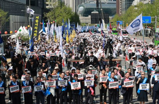 20일 서울 중구 숭례문 인근 세종대로에서 대한의사협회 주최로 열린 '의료정상화를 위한 전국의사궐기대회' 참가자들이 정부의 의대 증원 정책과 의료개혁특별위원회 운영 등을 규탄하고 있다. 연합뉴스