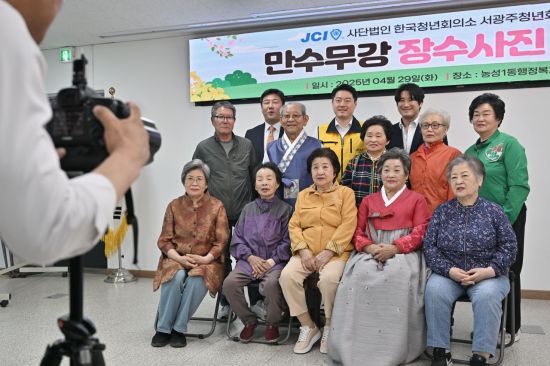광주 서구노인종합복지관 맞춤돌봄서비스 이용 어르신들이 29일 서구 농성1동 행정복지센터에서 서광주청년회의소 후원으로 장수사진 촬영에 참여하고 있다. 광주 서구 제공