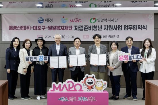마포구(구청장 박강수)는 4월 28일 마포구청 중회의실에서 애경산업(대표이사 김상준), 밀알복지재단(이사장 홍정길)과 함께 '자립준비청년 지원사업' 추진을 위한 3자 업무협약을 맺었다.
