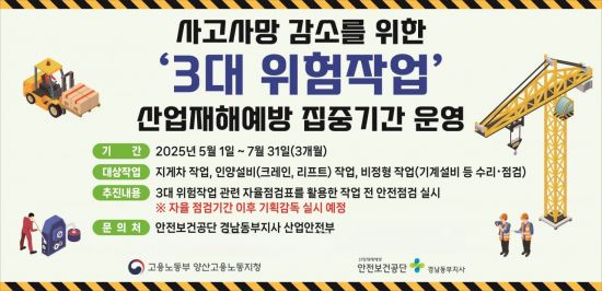 고용노동부 양산지청(지청장 권구형)과 안전보건공단 경남동부지사(지사장 안원환)는 5월부터 7월까지 '3대 위험작업 산재예방 집중기간'을 운영한다.