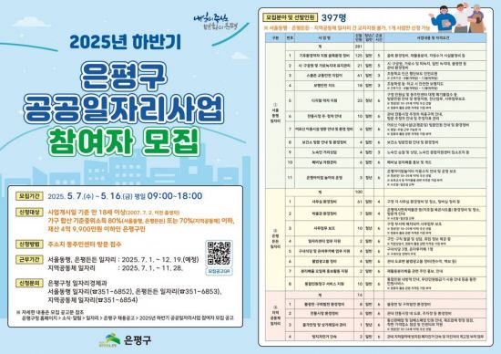 모집 기간은 이달 7일부터 16일까지 10일간이며, 모집 인원은 총 397명(서울동행 일자리 281명, 은평든든 일자리 100명, 지역공동체 일자리 16명)이다.