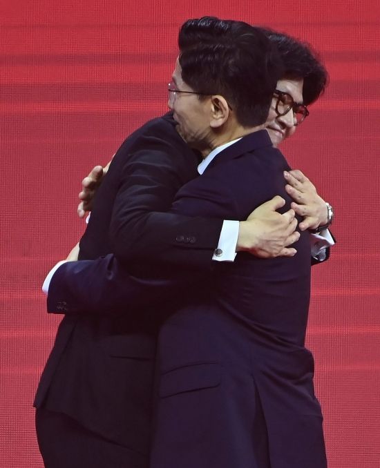 한동훈(왼쪽), 김문수 국민의힘 대선 경선 후보가 3일 경기 고양시 킨텍스에서 열린 5차 전당대회에서 포옹을 하고 있다.