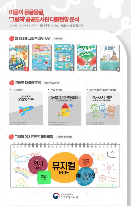 문화체육관광부 국립중앙도서관이 '2025 그림책의 해'를 맞아 최근 1년간(24.5.1.~25.4.30.) 1540개 공공도서관의 대출현황을 조사한 결과 '꽁꽁꽁 캠핑'이 가장 많이(2만743건) 대출된 것으로 나타났다.