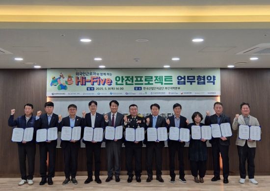 안전보건공단 부산광역본부(본부장 정종득)는 8일 목요일, 서부산권 산업단지(명지국가산업단지·신평장림일반산업단지) 내 외국인 근로자들의 안전을 강화하기 위해 한국산업단지공단 부산지역본부 등 유관기관·단체와 'Hi-Five 안전 프로젝트' 업무협약을 체결했다.