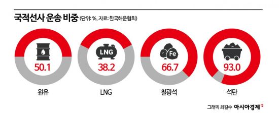 9일 한국해운협회가 국회에 건의한 '한국해운산업 발전을 위한 정책과제'에 따르면 2023년 기준 국적선사의 LNG 적취율은 38.2%로 원유(50.1%), 철광석(66.7%), 석탄(93.0%)에 비해 현저히 낮다. 수출입 물동량의 99.7%가 해운을 통하고, 특히 핵심에너지 수입은 100% 해상 운송으로 이뤄지는 현실과 괴리가 크다.