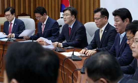 권성동 국민의힘 원내대표가 9일 국회에서 열린 원내대책회의에서 발언하고 있다.