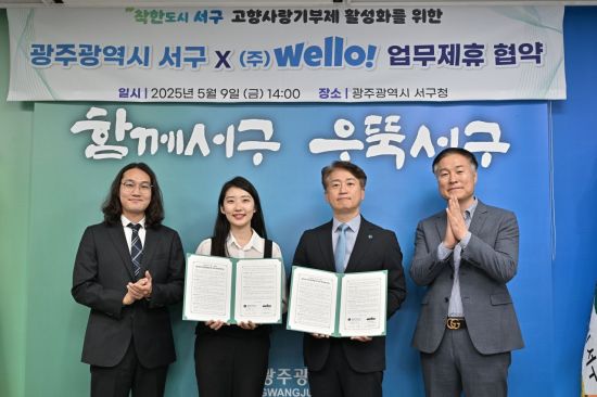광주시 서구(구청장 김이강)가 고향사랑기부제 활성화와 지역경제 자생력 강화를 위해 민간 플랫폼인 ㈜웰로(대표 김유리안나)와 9일 업무협약을 체결하고, 전국 최초로 모바일 기반 고향사랑기부 서비스를 도입한다.