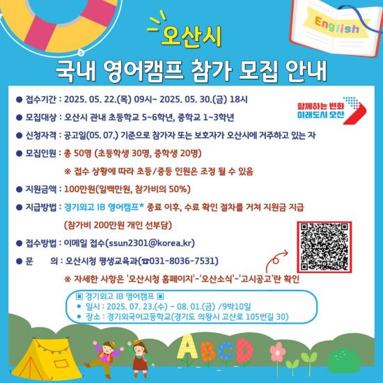 경기도 오산시는 관내 초·중학생을 대상으로 '여름방학 영어캠프' 참가자를 오는 22일부터 30일까지 선착순 모집한다.
