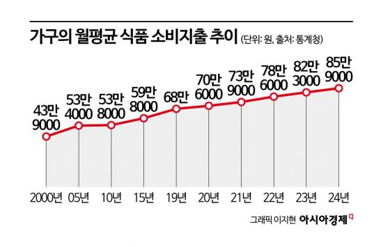 우리나라의 가구당 월평균 식비 지출은 코로나19 팬데믹 이후 빠르게 증가하고 있다. 2019년 68만원이던 식비 지출액은 코로나19 유행이 본격화한 이듬해 처음 70만원을 넘겼고, 2023년에는 80만원을 돌파했다. 지난해 85만원을 넘기며 90만원에 육박하는 수준까지 늘어났다.