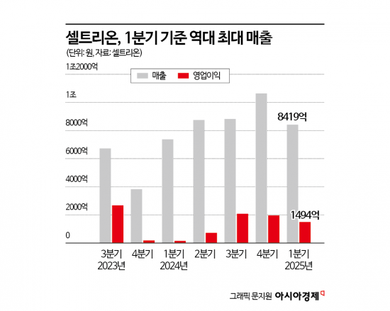 셀트리온이 올해 1분기 연결 기준 매출액 8419억원, 영업이익 1494억원을 기록했다. 1분기 기준 역대 최대 매출이다.