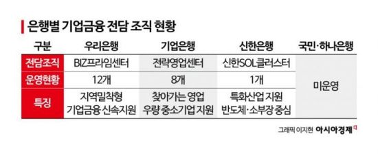 우리은행이 전국 주요 지역에서 신규 영업 성과를 보이자 기업은행도 벤치마킹했다. 기업은행은 '찾아가는 영업' 전략 아래 '전략영업센터'를 만들었다. 현재 8개 점포에서 우량 중소기업을 지원하고 있다. 신한은행도 특화산업(반도체)을 지원하는 '신한SOL클러스터'를 만들었다.