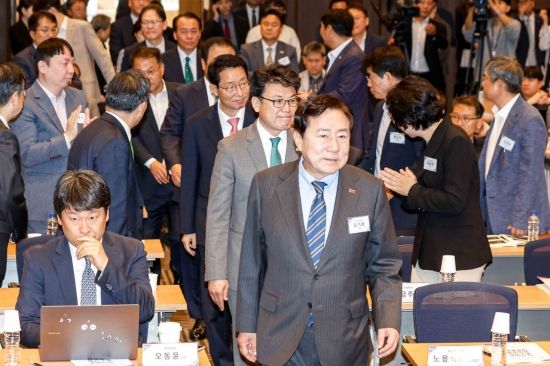 김기문 중소기업중앙회장과 진성준 더불어민주당 정책위의장, 김상훈 국민의힘 정책위의장이 12일 서울 여의도 중소기업중앙회에서 열린 '차기정부 중소기업 정책방향 대토론회'에 참석하고 있다.
