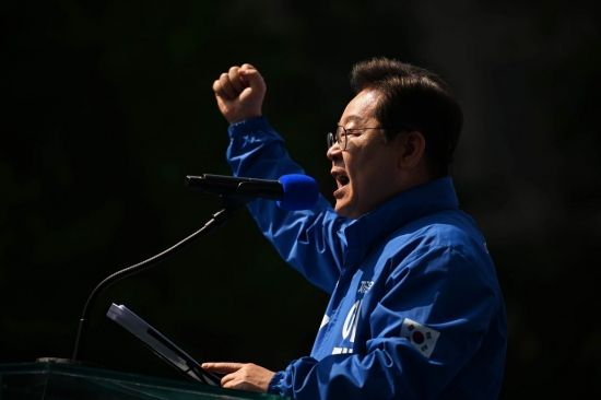 이재명 더불어민주당 대선후보가 제21대 대통령선거 공식 선거운동이 시작된 12일 서울 청계광장에서 열린 '빛의 혁명' 광화문 유세에서 연설하고 있다.