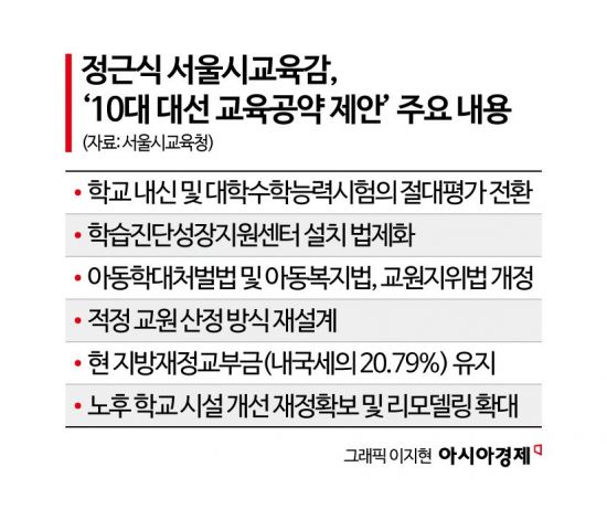 13일 정근식 서울시교육감은 이러한 내용이 담긴 '10대 교육 공약'을 각 정당에 전달하고, 새 정부의 교육 정책에 반영될 수 있도록 해달라고 요청했다.