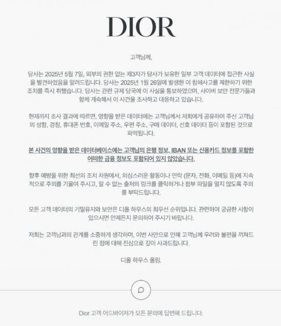 13일 업계에 따르면 디올은 최근 고객들에게 보낸 이메일을 통해 "지난 1월 26일 외부의 권한 없는 제3자가 일부 고객 데이터에 접근한 사실을 5월 7일에 인지했다"며 "침해사고를 제한하기 위한 조치를 즉시 취했다"고 밝혔다.