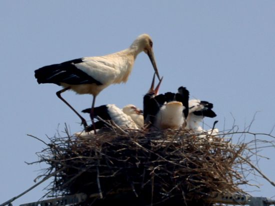 13일 광주환경운동연합에 따르면 최근 나주 부덕동 일대 고압 송전철탑 위에서 황새 한 쌍이 둥지를 틀고 새끼 네 마리를 기르고 있는 모습이 시민 제보를 통해 촬영됐다.