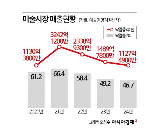 이 같은 불황은 경매 시장에서도 뚜렷하게 나타난다. 19일 예술경영지원센터에 따르면 지난해 국내 주요 10개 경매사의 온·오프라인 미술품 낙찰 총액은 1조1127억원으로 최근 5년간 가장 낮은 수준을 기록했다. 낙찰률은 전년보다 2.5%포인트 하락한 46.7%로, 2021년 호황기 때의 66.4%와 비교하면 크게 떨어졌다. 경매 횟수는 266회로 전년보다 11회 줄었고, 출품작 수는 2만4023점으로 전년 대비 15.9% 감소했다.