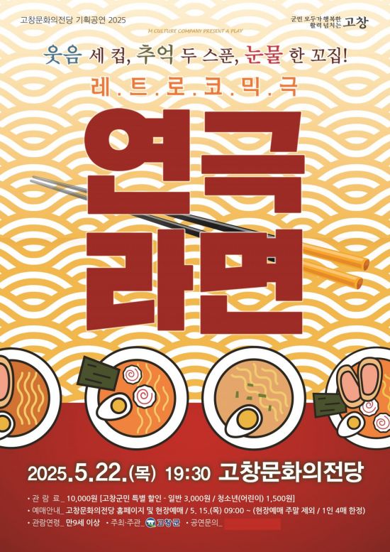 전북 고창군은 오는 22일 오후 7시 30분 고창문화의전당에서 대학로 대표 인기연극 '라면' 공연이 열린다고 14일 밝혔다.