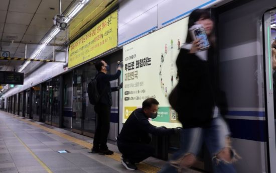 서울시선관위 관계자들이 14일 서울 종로구 지하철 4호선 혜화역 승강장 스크린도어에 투표독려 홍보물을 첩부하고 있다.