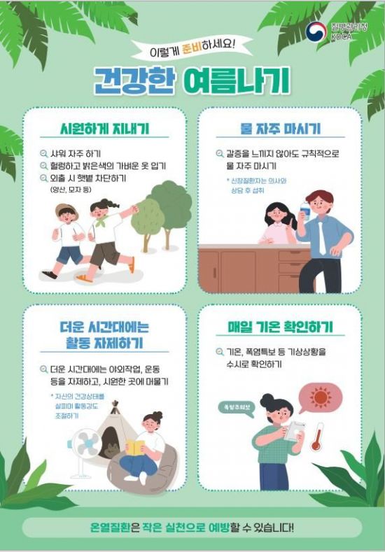 질병청은 여름철엔 폭염 시엔 외출을 자제한 채 물을 자주 마시고, 충분한 휴식을 취하는 등 건강수칙을 철저히 준수할 것을 당부했다. 특히 어린이와 노약자, 만성질환자는 온열질환에 더욱 취약하기 때문에 집안이나 자동차 등 창문이 닫힌 실내에 홀로 남겨두지 않도록 주의해야 한다고 강조했다.